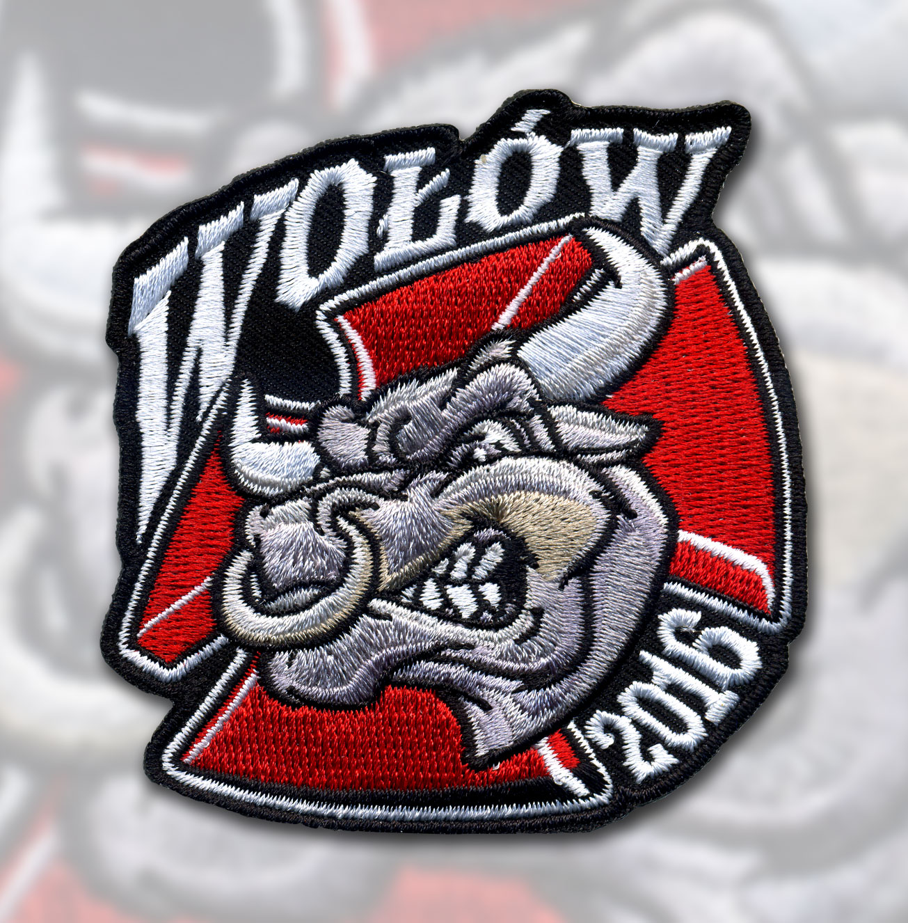The patch is embroidered with red, white and sort of grays threads on black fabric. It is custom shape patch. It shows the furry bull on the background of red iron cross. There is large inscription “Wołów” at the top and “2016” year in the bottom left corner.